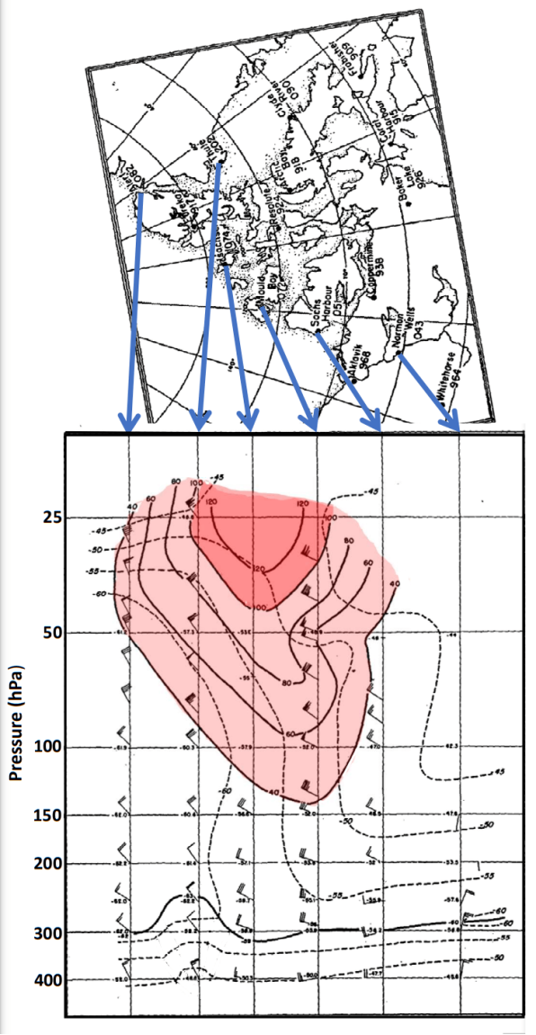 Lee and Godson examined the instantaneous winds on a few selected days during the winter. They noted that the jets that they saw were not aligned exactly zonally and they used the available data to characterize the component of the wind parallel to the jet axis. Figure 4 shows an example from their 1957 paper. The contours are for the north-west component of the wind plotted as a function of distance along the chain of stations shown from Alert (82.5oN, 62oW) at the left to Norman Wells (65oN, 127oW) on the right, i.e. on a rough northeast-southwest section stretching 2500 km. Here I have combined a map identifying the individual stations with the contour plot of the wind. I have added shading to distinguish regions with north-west winds greater than 40 knots and greater than 100 knots (deep shading). This approach allowed Godson to depict the winds in the core of the jet stream as they appear in an instantaneous snapshot.