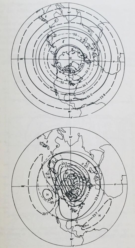 The research at McGill in the early 1960’s would provide important empirical input into seminal work on stratospheric dynamics over the subsequent decade. I will mention here two notable examples. First the classic 1970 paper of Taroh Matsuno formulating a numerical model of stationary Rossby waves in the extratropical stratosphere includes as motivation references to three of Boville’s observational papers (1960, 1963, 1966). In 1971 Matsuno generalized his 1970 model and made the fundamental discovery of the mechanism of stratospheric sudden warmings. Then Jim Holton in his 1975 pioneering monograph The Dynamic Meteorology of the Stratosphere and Mesosphere includes a version of a figure prepared by Hare showing a polar projection of the long term mean January and July 30 hPa heights (reproduced here as Figure 5). This served as the fundamental observational background to Holton’s discussion of stratospheric quasi-stationary Rossby waves.