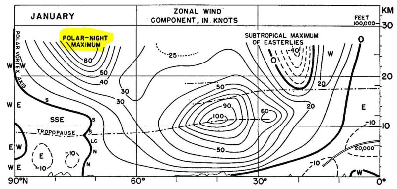 While his high latitude results are fairly realistic, Kochanski’s plot for the tropical and subtropical stratosphere agrees rather poorly with more modern determinations of the zonal wind climatology in the winter hemisphere. Kochanski was at a disadvantage back in 1955, of course, as the equatorial quasibiennial oscillation would not be discovered until 1961.